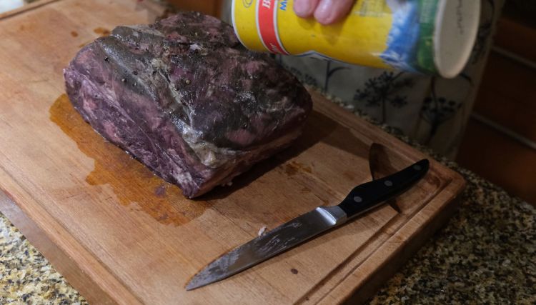 Hans hat das Fleisch zwei Tage vor unserer Versuchsküchen-Session in eine Marinade aus Rotwein, Knoblauch, Zwiebeln, Rapsöl, reichlich schwarzem Pfeffer, Nelken und einem Lorbeerblatt eingelegt. Um die ‚Wirkung‘ der Marinade zu intensivieren, hat er sie vakuumiert (es geht aber natürlich auch ohne 😉).