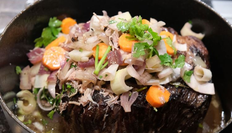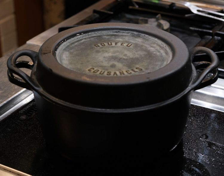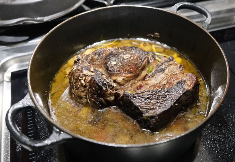 5 – In einem Doufeu-Bräter lassen wir das Ganze zwei Stunden bei geringer Hitze kochen. Falls Du keinen entsprechenden Topf hast, kannst Du den Braten auch in den Ofen stellen: und zwar für circa zwei Stunden bei 100 Grad Celsius (in diesem Fall den Garvorgang gegen Ende besser regelmäßig kontrollieren, weil wir die genauen Garzeiten nicht kennen …).