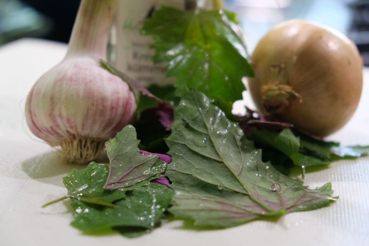 Es sind ansehnliche Exoten, die uns Sabine Anfang Juni in unseren Einkaufskorb legt: Riesengänsefüße. Auch wenn ihr Name Anderes vermuten lässt, handelt es hierbei um eine Gemüsesorte – sie werden auch schlicht als Baumspinat bezeichnet. Zumindest in rohem Zustand bieten sie auch etwas fürs Auge: kleine gezackte Blätter in minzfarbenem Grün kombiniert mit einem magentafarbenen Rosaton. Ursprünglich wohl ein Einwanderer aus dem Himalaya hat er inzwischen zumindest im südlichen Alpenraum verschiedentlich Wurzeln geschlagen. Jetzt, wo wir ihn in unserer Versuchsküche verkocht haben und er mithin in unser Bewusstsein vorgedrungen ist, entdecken wir ihn in diesem Frühsommer am laufenden Band in Bauerngärten und auf Gemüseäckern.