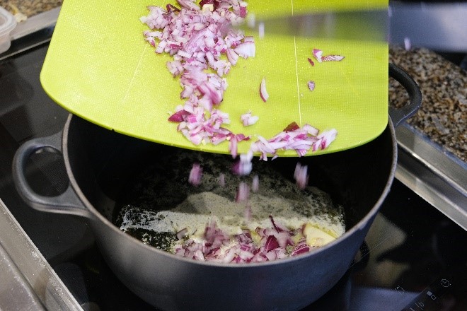 4 – Auch Zwiebel und Kassler schneiden wir in kleine Stücke.
