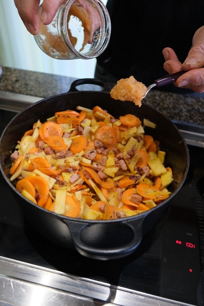 7 – Zum Schluss geben wir das Gemüse, den Gemüsebrühwürfel und das Wasser hinzu. Während der ca. 20-minütigen Kochzeit (bei geschlossenem Deckel) decken wir schon mal den Tisch und freuen uns auf unser Rüben-Duo.